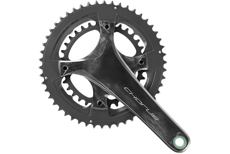 El nuevo plato Chorus es un verdadero concentrado de tecnología y versatilidad. Es técnicamente avanzado porque aprovecha la tecnología de construcción unidireccional en fibra de carbono obtenida directamente del molde sin ninguna pintura superficial y utiliza el perno Ultra-Torque de acero como el plato Record. Es versátil, ya que el nuevo círculo de bulones de 123mm confiere una estructura de prestaciones extremas, al tiempo que asegura una más amplia variedad de segmentos de uso. Disponible con bielas de 165, 170, 172,5 y 175 mm, el nuevo y reducido círculo de bulones del plato Chorus lo hace compatible con engranajes 52/36, 50/34 y con las nuevas coronas 48/32.